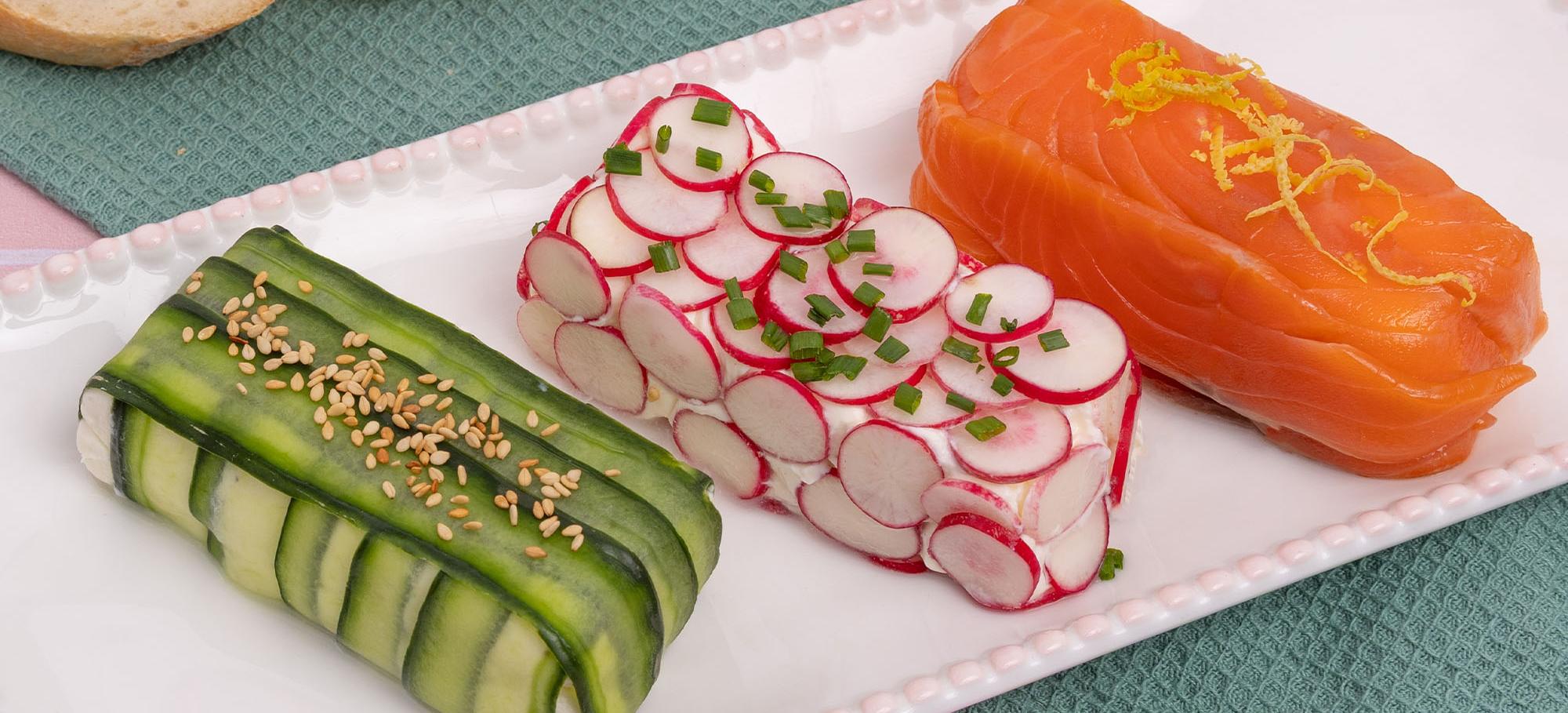 Couper le concombre en lanières à l'économe et les radis en rondelles fines. Découper le saumon aux dimensions des empreintes du moule à mini-cakes.