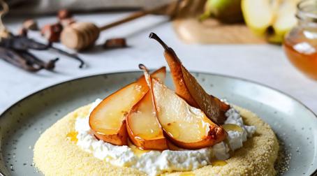 Poires rôties au miel, fromage blanc et semoule