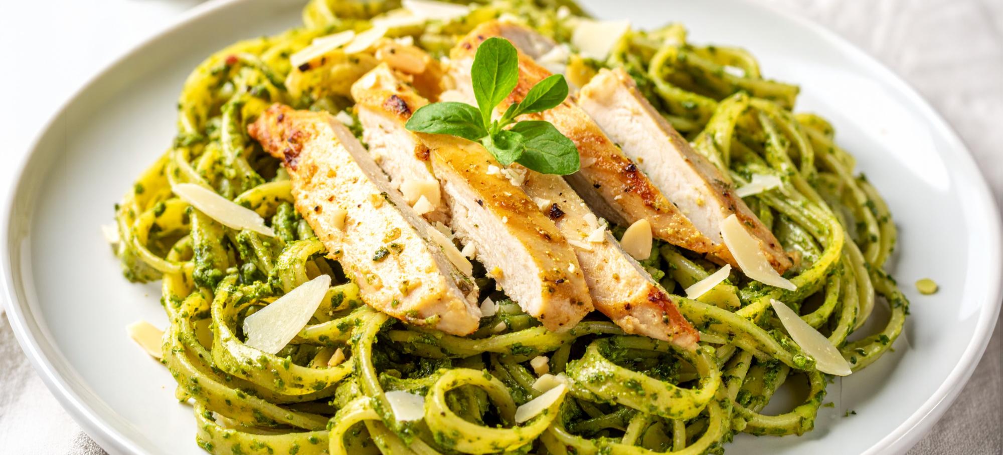 Répartir les pâtes au pesto dans les assiettes, ajouter les lamelles de poulet et servir chaud.