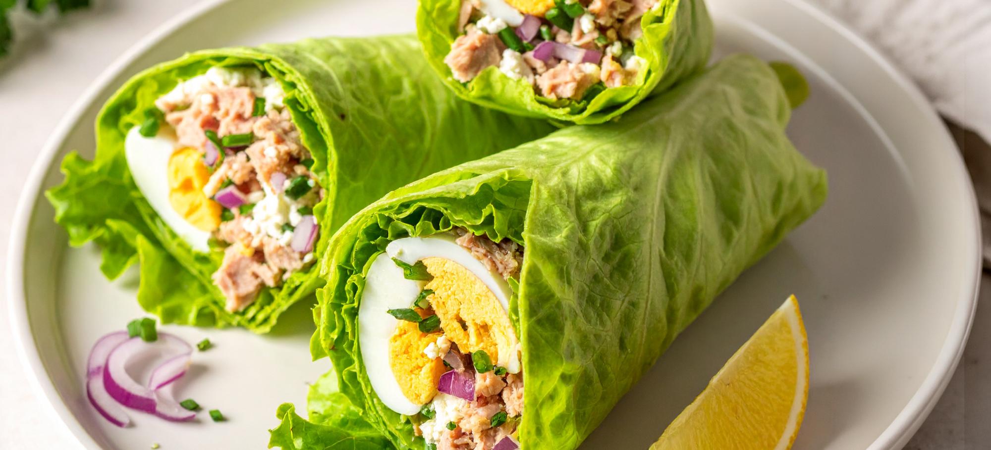 Déposer un peu de mélange thon-oeufs au centre de chaque feuille de laitue, puis les refermer pour former des wraps. Servir immédiatement.